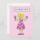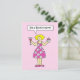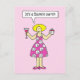 A lady in a pink dress which has a dice pattern on it saying 'It's a bunco party'. The image has a pastel pink background. The lady is holding a pink cocktail and a cup cake.