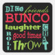 Fun multicolor subway art graphic bunco design. Background colour can be changed. Featured are the words friends, bunco, dice, throw, toss, chat, laughter and good times. Makes a great and clever prize or gift. Great for your next Bunco event.