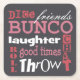 Fun and Colourful Bunco Inspired Graphic Design.Great coasters for your glasses filled with wine, sangria, margaritas, beer, water, soda, punch and more. Makes a fun gift or prize. Design features subway art with different words: dice, friends, bunco, laughter,roll, good times, throw and chat. Background colour can be changed to fit your own colour theme. Great for Bunco Night and Bunco Fundraisers.