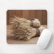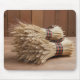 Bundles of wheat are neatly tied with plaid ribbons, resting on a wooden surface.