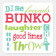 Fun colourful graphic subway Bunko art design. Featured are different coloured font words such as Bunko, dice, friends, roll, laughter, good times, chat, and toss. Great as a gift or prize. Background colour can be changed.