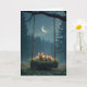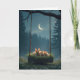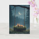 Three young rabbits nestle together on a grass-covered swing hanging from a tree branch set against a mysterious forest backdrop with a crescent moon illuminating the sky.