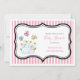 A baby shower invitation with a mum and baby bunny standing together. Fresh springtime daisies in the background. Some whimsical butterflies fluttering above. Set on a pink striped background. The back of the invitation has a pastel coloured bunting banner and some pink butterflies.