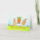 In the centre of this card two bunnies have come together, The one on the left is smiling and holding out a serving dish to the one on the right. On it is a birthday cake. A huge orange carrot is sticking out of it. It has a single red lit candle sticking out from the middle of its leaves. The second bunny is so overjoyed by the sight, he jumps in the air, spreading his little arms and laughing. He is wearing a colourful party hat. The bunnies are standing in front of a light blue background, on some light green grass, on which the words "Happy Birthday" are written in hand written yellow letters.