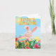 Such a cute and adorable Easter card. A colourful graphic design of a bunny rabbit holding on to its Easter egg, sitting in the grass surrounded by colourful flowers and decorative Easter eggs.