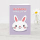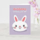 This card features a stylised white bunny head resting in the lower part of the design, set against a soft lavender background 🌷. The bunny has upright ears with pink inner details, small black eyes, a tiny pink nose, and round blush cheeks that give it a tender, friendly look, like it’s leaning in for a sweet hello. Just above the bunny, a two-line message sits in the upper half, with the first line in coral lettering and the second line in white lettering for a gentle contrast. The rounded letter shapes feel soft and affectionate, echoing the bunny’s calm expression and adding a cosy, close-to-you tone 🐰. Fine whisker lines and a small curved mouth add a hint of warmth, as if the bunny is quietly smiling at someone special. A faint shadow under the bunny head helps it stand out from the background without adding any harsh edges. The coral text is centred above the bunny, with the white text directly beneath it, both floating neatly on the lavender field.