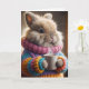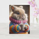 A fluffy rabbit wears a colourful cashmere sweater while holding a steaming cup of coffee for thinking of you.