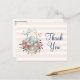 A party thank you postcard decorated with an illustration created with watercolors. A cute bunny rabbit wearing a blue dress sitting in a basket surrounded by her eggs. Butterflies flutter around the basket which is decorated with a fancy flower bouquet. Peach and white striped background. Personalised message on the back.