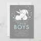 Sweet Bunny Love Twin Boys Baby Shower Invitation featuring the cutest white bunnies framed with a floral wreath set on a grey background. Flip our twins invitation over to view a coordinating floral background.