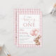 This charming 1st birthday party invitation features a cute little baby bunny holding balloons, and a pink gingham background. The reverse features the birthday girl's special photo. Designed by Thisisnotme©