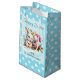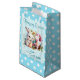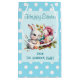 This is a cute Easter gift bag featuring a watercolor image of a bunny, Easter eggs and flowers, with a blue and white polka dot border. The text on the bag is customisable with your own.
