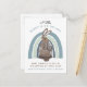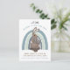 Whimsical cute woodland illustrated bunny and rainbow pregnancy postcard announcement in pastel blues and brown.