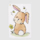 Cute, adorable brown bunny rabbit with a white fluffy tail sitting next to a yellow flower and bumble bees buzzing around his head. Original art in watercolor paints.