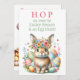 This beautiful Easter bunny is wearing a floral garland and is sitting amongst decorated Easter eggs. She says "Hop on over to Easter Brunch and an Egg Hunt" The reverse side you personalise with all of your information about the special day. A cute little easter chick wearing her Easter hat is peaking out from the side and there are several intricately painted Easter eggs.