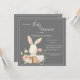 Adorable watercolor hand drawn bunny rabbit in a basket baby shower invitation. Grey background. The simple soft colours sets the tone for a sweet themed baby shower. Such a sweet and simple invitation for that special event.