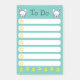 Cute, adorable teal To Do lists. Each page of these notelets feature two small white bunny rabbits holding an orange carrot. Each rabbit has one ear up and one ear flopping down. They have little pink toes and rosy cheeks. In the space between the bunnies are the words To Do in a dark teal text. Below the rabbits are seven white spaces to write your notes with a yellow star at the beginning of each space. Then at the bottom of the notes is a row of yellow flowers to finish of this kawaii design.