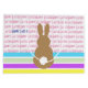 This graphic design features a brown silhouette bunny, layered on top of pastel coloured stripes and a repeating text pattern. The majority of text is pink with the words Happy Easter, above the bunny's ears in a deep purple. This design is on both sides of the bag.