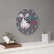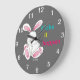 An original watercolor painting by Anne Ormsby of a bunny with the slogan, "Make it Hoppen" adorns this fun wall clock.