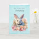 Birthday card with a watercolor image. A white gray bunny rabbit surrounded by a garland of pink and peach roses. For bunny lovers and Easter themes and birthdays and showers.