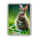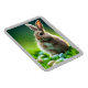 This magnet shows a darling brown and white bunny enjoying the sunshine of spring as she sits on the grass with colourful candy eggs near her feet.