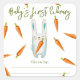 Gender neutral baby shower invitations. Featuring the saying 'A LITTLE BUNNY IS ON THE WAY!', an illustration of a watercolor bunny (rabbit) with carrot in paws, and many orange colour carrots. Matching items available.