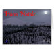 The view from my mountainside cabin in the Idaho panhandle; near the town of Bonners Ferry. Moonlight, ever so slightly obscured by clouds, reflects off the snow-covered mountains. Conifers cover the landscape. ""Buon Natale" appears in red. Sasquatch lives here.