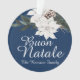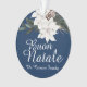 This holiday ornament features an Italian Christmas theme with watercolor flowers on a navy blue background. The phrase Buon Natale, which translates to "Merry Christmas" in Italy, is printed in an elegant script font across the bottom portion. A winter floral bouquet of white poinsettias, pine branches, a pine cone, and winter foliage is pictured above the buon natale greeting. A sample family name is printed at the bottom, which you can personalise to include your own custom name or other text.