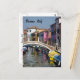 These colourful houses are located on the island of Burano, near Venice, Italy. Also known as the Lace Island, this is a place where people believe in colour! Here the pink, yellow beige, blue and white houses are reflected in the narrow canal lined with small boats, each as colourful as the houses.A white and brown-painted footbbridge arches across the lower half of the image. A light blue sky forms a background above the houses. At the top left of the image are the words, "Burano, Italy" in black script. Photo copyright Gail Storrs 2006.