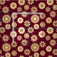 Deep burgundy background sets off four different designs of antiqued gold coloured baroque style flowers in a random pattern.