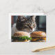 A serene tabby cat sits calmly, with two cheeseburgers placed in front of it, seemingly waiting for the perfect moment to indulge. The cat's gentle gaze is introspective, lost in thought as it contemplates the deliciousness before it. The simplicity of the image belies its charm, as the subtle details of the cat's fur and the tantalising burgers come together to create a delightful visual treat. Created using AI technology, this design is available on a variety of Zazzle products, from clothing to home decor and more, ready to bring a touch of feline whimsy to your daily life