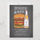 Modern and fun chalkboard burgers & brew barbecue engagement party invitation featuring a bottle of beer with a huge hamburgers set on a black chalkboard background & a matching red chequered cloth back for a special touch .