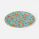 Blue paper plates for a burger party or BBQ with a pattern of cheeseburgers, fries, stars, and hearts.