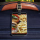 Mark your luggage for your next trip with this fun tag with juicy burgers and fries. Replace the placeholder text on the back with your own info or other text.