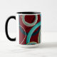 A pretty design featuring a burgundy background with abstract lines and circles in various colours and sizes.