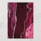 This elegant modern wedding menu features a burgundy red watercolor agate border trimmed with faux silver glitter. The customisable text combines silver grey handwriting script and sans serif fonts on a navy blue background. The burgundy and silver agate design is repeated on the reverse side.