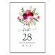 Red burgundy and white wedding table number cards with accents of forest green. Featured are dahlia, chrysanthemum and roses.