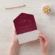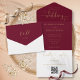All in one burgundy and gold wedding invitation featuring elegant hearts script typography and monogram initials. The invitation includes a perforated RSVP card with your personalized wedding QR code. Designed by Thisisnotme©