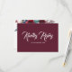 Sophisticated and chic RSVP card. The front of the card is a rich burgundy with Kindly Replay written in a large flowing script. The response date is written below. The back of the RSVP card features a beautiful floral display of burgundy, light teal and creamy pink flowers. Leaves and berries create texture and pull the design together. This RSVP card is party of my Burgundy Watercolor Boho chic Floral Collection. You should be able to see a link to it on this page. Please contact me for a link, if it isn't visible.