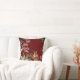 Stylish throw pillow features an artistic botanical floral design in a burgundy colour palette with earthy accents. An artistic floral design features a blooming tiger lily and an abstract composition with faint geometric circles and olive branches and blooming flowers on a burgundy wine coloured background. This layered composition is built on combinations of repeated leaves, circles and flowers, which are overlapped and interlaced to form an intricate and complex design. The design elements are layered and and interspersed to give perspective and depth to give depth and perspective to the overall design.