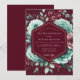 A rich burgundy backdrop showcases large, ruffled blossoms in muted teal and soft pink hues. Delicate foliage intertwines with the blooms, creating a romantic and slightly moody atmosphere. This design evokes an enchanting and sophisticated feel, perfect for a special occasion.