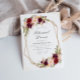This rehearsal dinner invitation features watercolor burgundy blush flowers and a brown geometric frame.