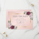 Burgundy and blush wedding save the date cards featuring a gold frame decorated with roses. Matching items available.