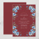 Deep burgundy tones provide a moody backdrop for delicate cornflower blue watercolor flowers and lush greenery. The design features soft petals resembling cherry blossoms paired with small blue berries for a sophisticated wintry look. This striking colour palette creates a romantic and elegant aesthetic suitable for formal late-year nuptials.