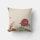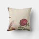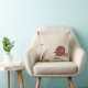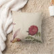 Burgundy and cream throw pillow features a simple minimalistic floral design with a vintage buttercup flower as the focal point, framed by stylish amaryllis with faint gold design elements; the layered composition gives depth and perspective to the overall design.