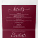 All in one burgundy tri-fold wedding invitation featuring elegant typography. The invitation includes your celebration guest information details and a detachable RSVP card. Designed by Thisisnotme©