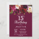 Burgundy Floral 15th Birthday Party Invitation for Girl Lady Teen Teenage. Burgundy Red Birthday Party Invite. Burgundy Watercolor Floral Flower. 13th 15th 16th 18th 20th 21st 30th 40th 50th 60th 70th 80th 90th 100th. For further customisation, please click the "Customise it" button and use our design tool to modify this template.