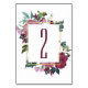 Burgundy floral table number. Maroon wedding Number