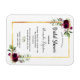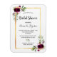 On front: A white background with a faux gold frame. Decorated with dark burgundy flowers, roses, boho style feathers and greenery. Personalise and add the name of the bride to be and party details.