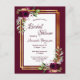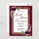 On front: A burgundy background with a faux gold and white frame. Decorated with dark burgundy flowers, roses, boho style feathers and greenery. Templates for the bride's name and party details. The name and the text: Bridal Shower are written with a hand lettered style script, bugundy coloured letters.