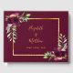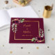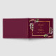 A modern elegant guest book decorated with watercolored roses in burgundy with feathers and greenery. With a faux gold frame. Burgundy background. Templates for your names and wedding date. The names on front are written with a modern and trendy hand lettered style script. golden coloured letters. Add your text on the spine. Golden text